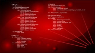 Este documento presenta el proyecto de una Casa de la Cultura en Huayucachi, Perú. Resume los sistemas funcionales, formales y constructivos de referentes nacionales e internacionales, y analiza el contexto físico, económico y social. Define los usuarios y sus necesidades, y propone un programa arquitectónico con salas para reuniones, talleres, oficinas y un museo sociocultural, cumpliendo con normativas. El terreno propuesto tiene 1047m2 y se ubica en el distrito, buscando promover
