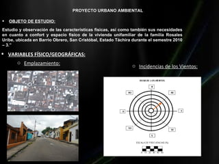 Este proyecto estudia una vivienda unifamiliar en San Cristóbal, identificando necesidades de los residentes como mayor seguridad y espacio. La propuesta redistribuye los espacios en las plantas existentes y agrega una tercera planta, mejorando la privacidad, incorporando un estudio y ampliando habitaciones. Se recomienda invertir en seguridad, vegetación y redistribuir espacios según normas de habitabilidad.