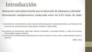 El documento presenta la problemática de la alimentación complementaria inadecuada entre los 6-23 meses, que puede contribuir al sobrepeso y obesidad. Propone la campaña "Nútrelos con amor" para difundir información a través de cápsulas televisivas con personalidades influyentes, y brindar orientación a madres en lugares públicos sobre una correcta nutrición complementaria que prevenga enfermedades.