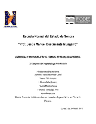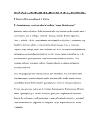 Este documento discute varios temas relacionados con la enseñanza y el aprendizaje de la historia en educación primaria. Explica que los niños y adolescentes tienen una comprensión limitada de los conceptos históricos y que esta mejora con la edad. También analiza la representación del tiempo histórico en los estudiantes y las dificultades que presentan al resolver problemas históricos. Finalmente, discute el razonamiento e inferencias necesarios para solucionar problemas históricos.