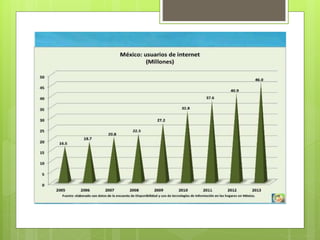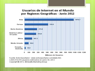 El documento resume el estado de Internet a comienzos del siglo 21. Explica que Internet conecta redes de ordenadores de todo el mundo y ha revolucionado la forma en que las personas se comunican y comparten información. Aunque cada vez más gente tiene acceso a Internet, sigue habiendo una brecha digital entre aquellos con acceso a la mejor tecnología y aquellos sin acceso o con acceso limitado.