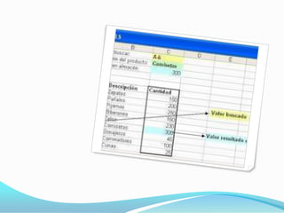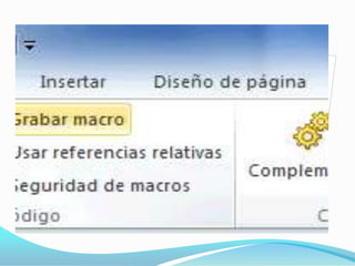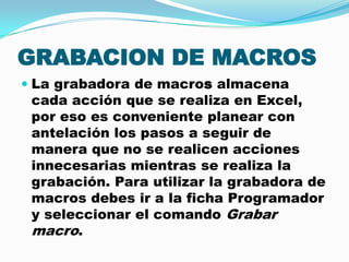 Este documento describe diferentes funciones de Excel como grabar macros, SI, CONSULTAR, PROMEDIO y formatos condicionales. La función SI devuelve un valor dependiendo de si una condición es verdadera o falsa. La función CONSULTAR busca valores en una columna. La función PROMEDIO calcula el promedio de valores numéricos. Los formatos condicionales aplican formatos a celdas basados en el cumplimiento de condiciones.