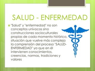 El documento resume la evolución histórica del concepto de salud y enfermedad desde una perspectiva empírica, mágica, religiosa y biocientífica. Explica que la salud y enfermedad son construcciones socioculturales que han variado a través del tiempo e involucran conocimientos, creencias y valores. Describe brevemente diferentes etapas como la medicina empírica, mágica, religiosa y la concepción actual multicausal ecológica de la salud.