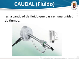 El documento habla sobre el caudal de fluidos y su importancia en procesos industriales. El caudal se define como la cantidad de fluido que pasa en una unidad de tiempo y es una magnitud física fundamental para medir el flujo de líquidos y gases a través de tuberías y equipos en procesos industriales.