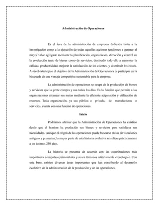 El documento trata sobre la historia y desarrollo de la administración de operaciones. Explica que surgió con la revolución industrial y la introducción de máquinas en la producción. Luego, se desarrollaron conceptos como la división del trabajo, la estandarización de partes intercambiables y las líneas de montaje. Más adelante, surgieron enfoques como las relaciones humanas, los modelos de toma de decisiones y la ingeniería de factores humanos. Finalmente, destaca la importancia de la productividad, competitividad y