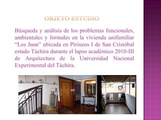 La vivienda "Los Juan" se encuentra ubicada en una zona plana de San Cristóbal, Táchira. El documento analiza los problemas funcionales, ambientales y de diseño de la vivienda, incluyendo la necesidad de un cuarto de estudio y mejoras a la iluminación y ventilación de algunas áreas. Los usuarios están satisfechos con los ajustes realizados a lo largo del tiempo para satisfacer sus necesidades, aunque aún se requieren algunas mejoras menores.