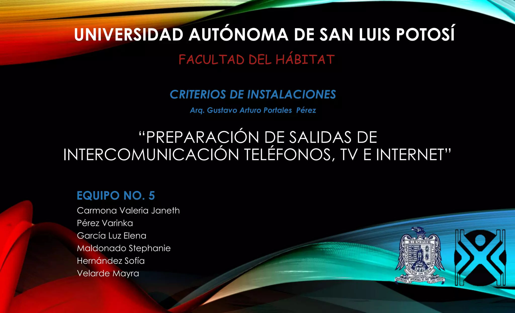 Este documento presenta los criterios e instalación de salidas para telefonía, televisión por cable, televisión satelital e internet. Explica los materiales y procedimientos necesarios para cada instalación, incluyendo divisores de cable, antenas parabólicas, rosetas telefónicas y módems. Concluye que los arquitectos deben considerar estas instalaciones al diseñar y planear la funcionalidad completa del espacio, en lugar de dejarlas como responsabilidad del usuario.