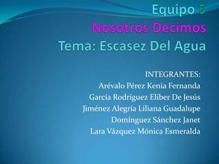 Este documento presenta los resultados de una encuesta realizada por 5 estudiantes sobre la escasez del agua. Contiene las 5 preguntas de la encuesta, las respuestas recibidas y la conclusión del equipo. Las 5 preguntas se enfocaron en la importancia del agua, los riesgos de la escasez, las acciones para cuidar el agua y cómo sería vivir sin agua. La mayoría de las personas entienden la importancia vital del agua pero no siempre la usan de forma correcta. El equipo concluye que debemos ser conscientes de n