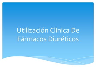 Este documento describe los diferentes tipos de fármacos diuréticos, incluidos los diuréticos proximales, de asa, distales y anticaliureticos. Explica cómo cada uno actúa en diferentes segmentos del nefron para aumentar la excreción de sodio, cloro y agua. También discute los factores que afectan la eficacia de los diuréticos y las posibles complicaciones de su uso, como la depleción de volumen, trastornos electrolíticos y edema refractario.
