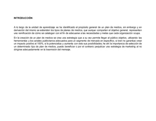 Este documento describe los diferentes tipos de planes de medios y la importancia de seleccionar el adecuado. Existen varias formas de clasificar los planes de medios para adecuarse a las necesidades de cada organización. Al seleccionar el tipo correcto de plan de medios en función de los objetivos, recursos y público objetivo de una empresa, se puede potencializar el impacto positivo de la estrategia de marketing y aumentar las posibilidades de éxito.
