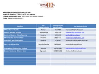 Este documento presenta una lista de 8 personas involucradas en la Institución Educativa el Paraíso, incluyendo su nombre, rol, número de documento de identificación y correo electrónico. Los roles incluyen rector, coordinadora, docentes, padre de familia, alumno y egresado.