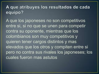 Los japoneses tienden a unirse para competir contra oponentes externos en lugar de competir entre sí, mientras que los colombianos son más competitivos internamente y buscan cargos más altos que otros colombianos, compitiendo entre sí en lugar de enfrentar oponentes externos como los japoneses.
