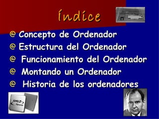 El documento describe la historia y estructura básica de los ordenadores. Explica que un ordenador es un sistema digital que incluye un microprocesador, memoria, buses y dispositivos de entrada/salida. Detalla las cuatro fases del funcionamiento de un ordenador basado en la arquitectura de von Neumann y resume brevemente los hitos más importantes en la historia de los ordenadores, desde las primeras calculadoras mecánicas hasta el ordenador personal moderno.