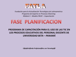 El documento presenta un programa de capacitación para docentes de la Universidad Beta en Panamá, enfocado en el uso de tecnologías de la información y comunicación (TIC) a través de la metodología PACIE. Se busca diseñar un sistema virtual que facilite la capacitación y mejorar las competencias tecnológicas de un personal docente que enfrenta limitaciones en su manejo de herramientas digitales. El programa incluye la estructuración de un campus virtual y el establecimiento de un departamento de educación en línea, además de estrategias para fomentar el aprendizaje colaborativo y la inclusión de tecnologías educativas.