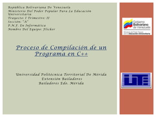 Este documento describe el proceso de compilación de un programa en C++. Explica que un compilador traduce un programa escrito en un lenguaje de alto nivel como C++ a un lenguaje de bajo nivel como código de máquina. Luego detalla que la compilación es necesaria, su finalidad, y los pasos para compilar un programa en C++. Finalmente, menciona el interés en comprender este proceso de compilación.