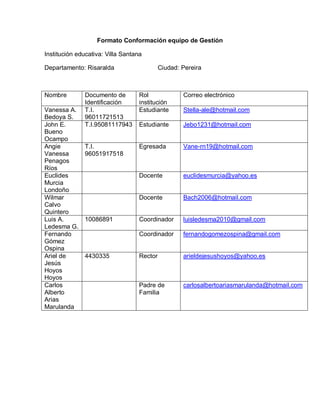 Este documento presenta el equipo de gestión de la Institución Educativa Villa Santana en Pereira, Risaralda. Incluye el nombre, documento de identificación, rol en la institución y correo electrónico de 13 miembros del equipo, entre ellos estudiantes, egresados, docentes, coordinadores, rector y padre de familia.
