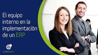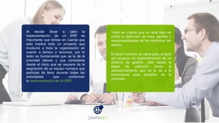 El documento enfatiza la importancia de seleccionar un equipo interno adecuado para la implementación de un ERP. Se recomienda incluir líderes de cada área de la empresa, un gerente de proyecto y un administrador del sistema. Cada miembro del equipo debe seleccionarse de acuerdo a sus habilidades y conocimientos relevantes. Además, es importante mantener informados a los usuarios finales y fomentar su participación para minimizar la resistencia al cambio. El éxito del proyecto depende del compromiso y trabajo