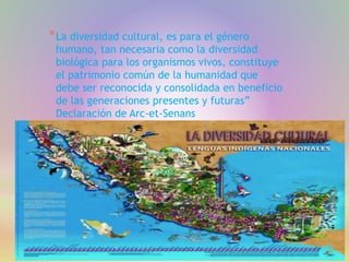 El documento describe la diversidad cultural de varias regiones de México, incluyendo detalles sobre la gastronomía, música, artesanías y trajes típicos de estados como Yucatán, Jalisco, Aguascalientes, Colima y Puebla. Resalta que cada región tiene elementos culturales únicos que reflejan su historia, y que la diversidad cultural de México es reconocida a nivel mundial.