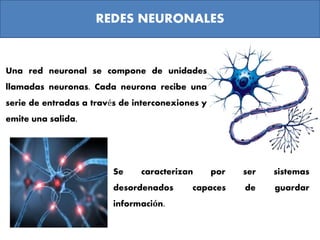 El documento describe las redes neuronales artificiales, incluyendo que se componen de unidades llamadas neuronas interconectadas, que aprenden automáticamente a partir de datos de entrada, y que tienen ventajas como la generalización, tolerancia a fallos y capacidad de operar en tiempo real.