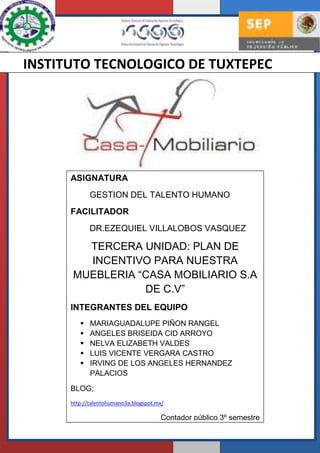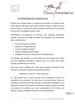El documento describe un plan de incentivos propuesto para la mueblería "CASA MOBILIARIO S.A DE C.V". El plan incluye incentivos de productividad, vales de despensa, recreativos y para reducir la merma. Los incentivos de productividad y vales de despensa se otorgarán mensualmente, mientras que los recreativos y de reducción de merma serán cada tres meses y anualmente respectivamente. El objetivo es motivar a los empleados para mejorar el desempeño y retener el talento.