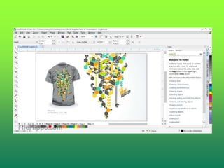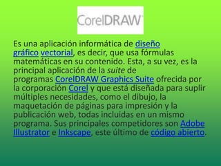 CorelDRAW Graphics Suite es una aplicación de diseño gráfico vectorial que permite el dibujo, maquetación y publicación web. Sus principales características incluyen herramientas para convertir esbozos a mano alzada en curvas vectoriales, importar espacios de trabajo desde versiones anteriores y compatibilidad con dispositivos táctiles y lápices gráficos.