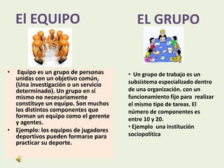 El documento contrasta los conceptos de equipo y grupo, y analiza las ventajas y desventajas del trabajo en equipo y en grupo. Un equipo es un grupo de personas unidas por un objetivo común, mientras que un grupo es un subsistema dentro de una organización para realizar tareas específicas. Trabajar en equipo o grupo tiene ventajas como compartir responsabilidades y tomar decisiones con mayor aceptación, pero también desventajas como consumir tiempo en reuniones o tener responsabilidades ambiguas. Finalmente, se describen las características de los grupos de