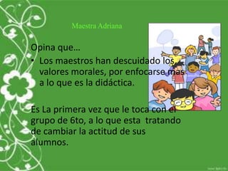 La maestra Adriana opina que los maestros se han enfocado más en la didáctica y han descuidado los valores morales. Ella está tratando de cambiar la actitud de sus alumnos de sexto grado. A diferencia de otros maestros, su experiencia ha sido en escuelas completas urbanas. Tuvo que aprender sobre la enseñanza multigrado en la práctica. Sus objetivos son que los estudiantes sean respetuosos, limpios y puedan pensar por sí mismos.