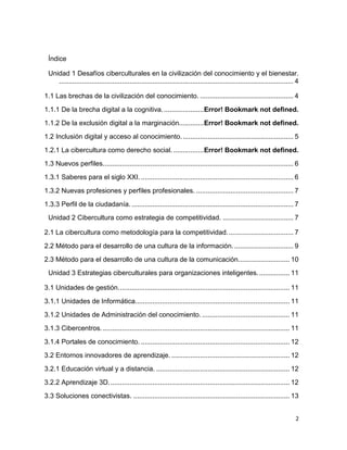 Este documento trata sobre los desafíos ciberculturales en la civilización del conocimiento y el bienestar. Habla sobre las brechas digitales y cognitivas y cómo llevar la inclusión digital y el acceso al conocimiento a toda la población. También menciona los nuevos perfiles y saberes requeridos en el siglo XXI, así como el uso de la cibercultura para la competitividad de las organizaciones y las políticas ciberculturales necesarias. El objetivo final es lograr una sociedad más justa e igualitaria mediante el uso