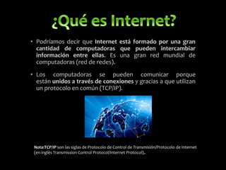 Este documento resume la historia y características de Internet. Comenzó como un proyecto militar estadounidense llamado ARPANET en 1969 que conectaba universidades y centros de investigación. En la década de 1990, la World Wide Web hizo que Internet fuera más accesible al público a través de la introducción de hipertexto, gráficos y formularios. Internet ahora es una red global de redes que permite el intercambio de información entre computadoras de todo el mundo a través del protocolo TCP/IP.