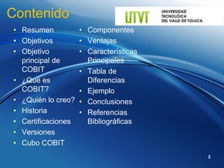 COBIT es una metodología aceptada mundialmente para el control de proyectos de tecnología de la información. Proporciona una guía de alto nivel para definir y evaluar los procesos relacionados con los sistemas de información de una organización. COBIT cubre cuatro dominios principales: planificación y organización, adquisición e implementación, soporte y servicios, y monitoreo.