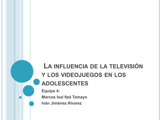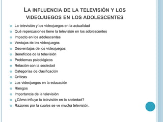 Este documento analiza la influencia de la televisión y los videojuegos en los adolescentes. Explora tanto los beneficios como los riesgos de estos medios, incluyendo su impacto en el aprendizaje, desarrollo psicológico y relaciones sociales. También discute categorías de clasificación, críticas comunes y el potencial educativo de los videojuegos. El documento concluye que si bien estos medios pueden mejorar algunas habilidades, su abuso puede causar problemas de concentración y aprendizaje en los jóven