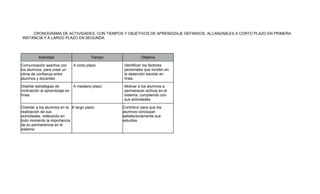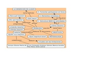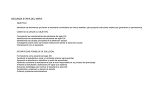 El documento describe una estrategia para identificar las causas de la deserción estudiantil en línea y proponer soluciones. Se propone conocer las características y necesidades de los estudiantes del siglo XXI, identificar las principales causas de deserción y cómo otras instituciones han evitado esto. Las posibles soluciones incluyen formar docentes del siglo XXI, ayudar a los estudiantes a crear un ambiente propicio para el aprendizaje y motivarlos a lograr sus objetivos.