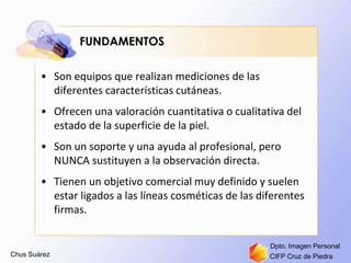 El documento describe un equipo de diagnóstico cutáneo llamado Dermoprime que puede medir el tipo de piel, hidratación, manchas, arrugas, elasticidad, textura y poros. Realiza estas mediciones a través de funciones como corneometría, sebometría y el análisis de imágenes. El equipo también permite comparar resultados de diferentes análisis, guardar comentarios e imágenes, e imprimir informes y recomendaciones personalizadas.