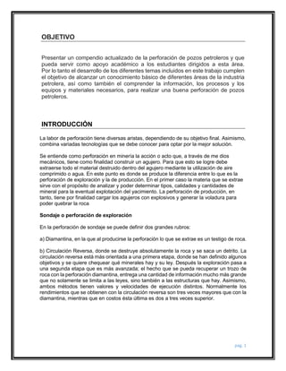 Este documento presenta información sobre diferentes métodos y equipos de perforación para la industria petrolera. Explica los objetivos de la perforación de exploración y producción, y describe equipos comunes como perforadoras de torre, pistolas de piso, y perforadoras de jumbo. También cubre varios métodos de perforación como rotativa, por percusión, con taladro, con agua a presión y con martillo neumático. Finalmente, concluye que la perforación rotativa es el método más común y que la industria continúa innovando para perfor