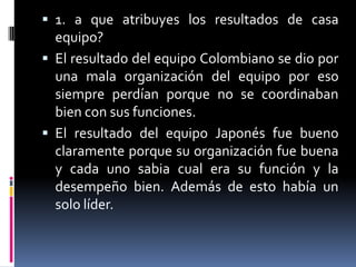 El documento analiza los factores que contribuyen al éxito o fracaso de los equipos de trabajo. Explica que el equipo colombiano tuvo malos resultados debido a una mala organización y falta de coordinación, mientras que el equipo japonés tuvo éxito gracias a una buena organización donde cada miembro sabía su rol. También define que el estatus se refiere a la posición dentro de un marco, y el rol a los patrones de conducta esperados para una posición dada. Finalmente, señala que para lograr altos niveles de