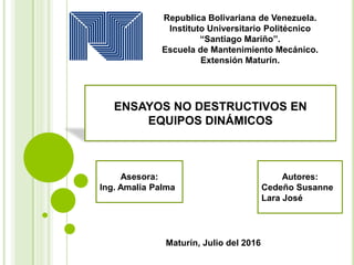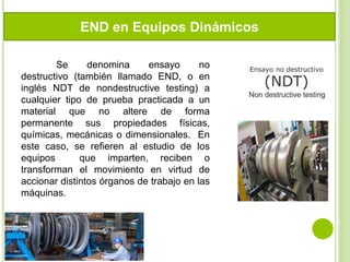 Este documento discute las técnicas de ensayos no destructivos (END) para diagnosticar fallas en equipos dinámicos. Reconoce que el análisis de vibraciones y el ultrasonido son dos de las técnicas más efectivas, ya que pueden detectar una variedad de problemas en maquinaria rotatoria como defectos en rodamientos. Sin embargo, señala que usar múltiples técnicas como END, análisis de aceites y termografía puede proporcionar un diagnóstico más completo.