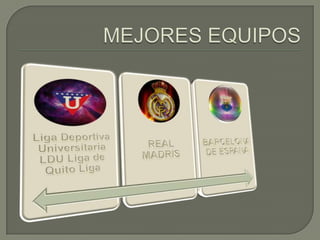 Este documento resume las reglas básicas del fútbol y menciona algunos de los equipos y jugadores más destacados. Explica que el fútbol es un deporte jugado entre dos equipos de 11 jugadores y describe reglas como anotar goles, lanzamientos de salida, fuera de juego, faltas prohibidas y más. También resalta que la Liga Deportiva Universitaria de Ecuador y el Real Madrid de España son dos de los equipos de fútbol más exitosos a nivel internacional.