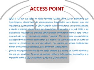 Un punto de acceso inalámbrico (WAP) es un dispositivo que conecta dispositivos inalámbricos para formar una red inalámbrica, permitiendo transmitir datos entre dispositivos conectados por cable y de forma inalámbrica. Los WAPs pueden conectarse entre sí para crear redes más grandes y permitir el "roaming", y tienen direcciones IP asignadas para su configuración. Los puntos de acceso crean la red inalámbrica al recibir, almacenar y transmitir información entre la red inalámbrica