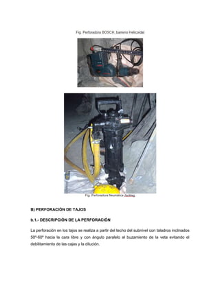 El documento describe los equipos y accesorios de perforación utilizados en la mina, incluyendo máquinas eléctricas y neumáticas para perforar tajos y frentes. También describe los procesos de perforación de tajos y frentes, incluyendo parámetros como la malla de perforación y cálculos de velocidad y eficiencia.
