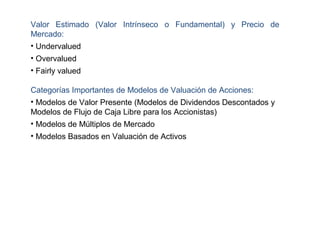 El documento presenta varios modelos de valuación de acciones, incluyendo modelos de dividendos descontados, flujos de caja libre, múltiplos de mercado y valuación de activos. Explica el modelo de dividendos descontados, incluyendo ejemplos, y el modelo de crecimiento constante de Gordon. También cubre la valuación de acciones preferentes y conceptos como la tasa de crecimiento sostenible, el ratio PER y la beta.