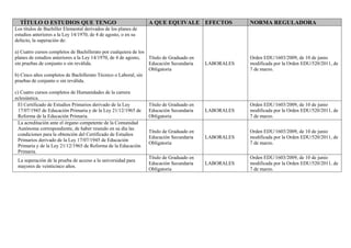 Este documento lista los títulos y estudios que equivalen a los títulos de Graduado en Educación Secundaria Obligatoria, Bachiller y Técnico de acuerdo a la normativa española. Se especifica el título al que equivale cada uno y la norma reguladora correspondiente. También incluye equivalencias entre los títulos de Técnico, Técnico Deportivo y Bachiller a efectos de acceso a empleos públicos y privados.