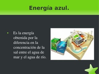 El documento describe las principales fuentes de energía renovables y no renovables. Entre las energías renovables se encuentran la energía azul, eólica, geotérmica, hidráulica, mareomotriz, solar y undimotriz. Las energías no renovables incluyen los combustibles fósiles como el carbón, gas natural y petróleo, así como el uranio utilizado en la energía nuclear.