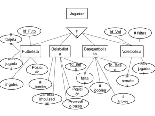 Este diagrama de entidad relación representa las entidades y relaciones entre eventos deportivos, equipos, jugadores, deportes, ubicaciones y entrenadores. Las entidades incluyen encuentros, equipos, jugadores, deportes, ubicaciones y entrenadores. Las relaciones muestran que los encuentros involucran a equipos, los jugadores pertenecen a equipos y juegan en encuentros para un deporte particular, y los entrenadores dirigen equipos.