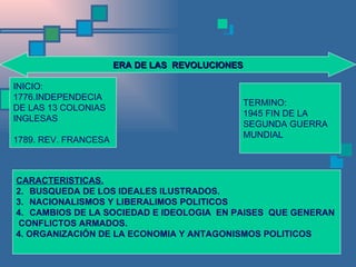 Este documento describe la Era de las Revoluciones desde 1776 hasta 1945. Cubre eventos clave como la Independencia de las 13 Colonias en 1776, la Revolución Francesa en 1789, el Imperio de Napoleón y la consolidación del estado burgués en Europa en el siglo XIX. También analiza los movimientos políticos e ideológicos como el nacionalismo, el liberalismo y el socialismo que surgieron durante este período.