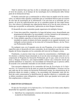 Este documento presenta el área de Tecnologías de la Información y la Comunicación para un programa de formación profesional. Primero, introduce la importancia de las TIC en la sociedad actual y cómo han cambiado los procesos de acceso a la información. Luego, establece los objetivos generales de capacitar a los estudiantes en el uso básico de herramientas TIC. Finalmente, detalla los contenidos agrupados en cuatro bloques: 1) el entorno del ordenador personal, 2) aplicaciones como procesadores de texto, 3) aplicaciones cer