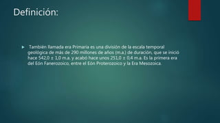 La era Paleozoica se extendió por más de 290 millones de años desde hace 542 millones de años hasta hace unos 251 millones de años. Se divide en los períodos Cámbrico, Ordovícico y Silúrico. Biológicamente, la era Paleozoica presenció el surgimiento de algas, esponjas, corales, moluscos, artrópodos como los trilobites e insectos, así como los primeros arácnidos, plantas vasculares, peces, anfibios y reptiles.