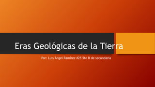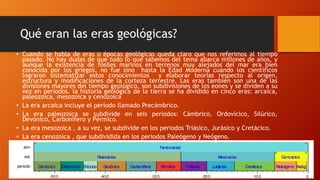 El documento resume las principales eras geológicas de la Tierra: la Era Arcaica, la Era Paleozoica, la Era Mesozoica y la Era Cenozoica. Cada era se subdivide en períodos que marcan hitos en la evolución de la vida en la Tierra, desde formas de vida primitivas en los mares durante el Paleozoico hasta la extinción de los dinosaurios y auge de los mamíferos en el Cenozoico. El documento también aborda brevemente el supereón Precámbrico y la teoría de la