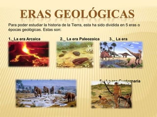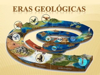 Este documento resume las diferentes eras geológicas de la Tierra, desde la era Precámbrica hasta la actual era Cuaternaria. Describe los principales eventos y formas de vida que existieron en cada era, incluyendo la aparición de los primeros seres unicelulares, el desarrollo de plantas y animales más complejos, la era de los dinosaurios, y la extinción de los dinosaurios dando paso a la era de los mamíferos.