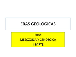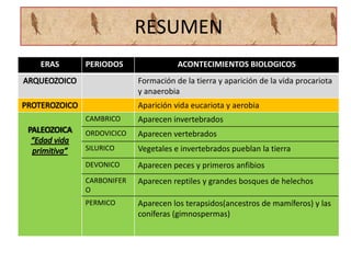 El documento resume las eras geológicas y los principales acontecimientos biológicos y climáticos asociados con cada era. Abarca desde la formación de la Tierra hace aproximadamente 4 mil millones de años hasta el presente, describiendo la deriva de los continentes, la aparición y evolución de la vida, y los cambios climáticos a lo largo de la historia de la Tierra.