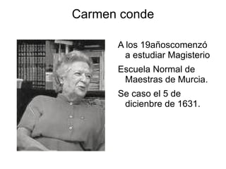 Carmen Conde fue una escritora española que se trasladó con su familia a Melilla a los 7 años, donde vivió hasta 1920. Estudió Magisterio en Murcia y se casó en 1931. Promocionó las obras completas de su marido Antonio Oliver después de su muerte en 1968. En 1978 fue elegida académica de la Real Academia Española, ocupando el sillón de su marido. Recibió varios premios literarios a lo largo de su carrera.